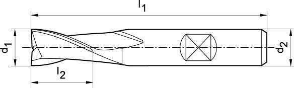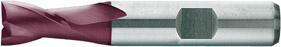 Drážkovací fréza (fréza na vrtané drážky), 2 břity, HSS-Co5-PM, TiAlN povrstvení Provedení: Zub do středu. Použití: Používá se na frézování klínových drážek a drážek pro pero, Ø tolerance e8 pro lícování P9. HSS-Co5 PM se vyznačuje vysokou tuhostí (vyšší stabilita hran, větší odolnost proti opotřebení) a větší životností. Doporučuje se při nestabilních podmínkách řezání.