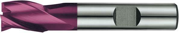 Drážkovací fréza (fréza na vrtané drážky), 3 břity, DIN 327, HSS-E PM, TiAlN povrstvení Provedení: Typ N, 30°, od Ø 3,0 mm zub do středu. Použití: Frézování klínových drážek a drážek pro pero, Ø tolerance e8 pro lícování P9 a pro obvodové frézování. HSS-E PM se vyznačuje vysokou tuhostí (vyšší stabilita hran, větší odolnost proti opotřebení) a větší životností. Rychlost řezu je asi o 50 % vyšší než u nástrojů bez povlaku. Možnost suchého obrábění.