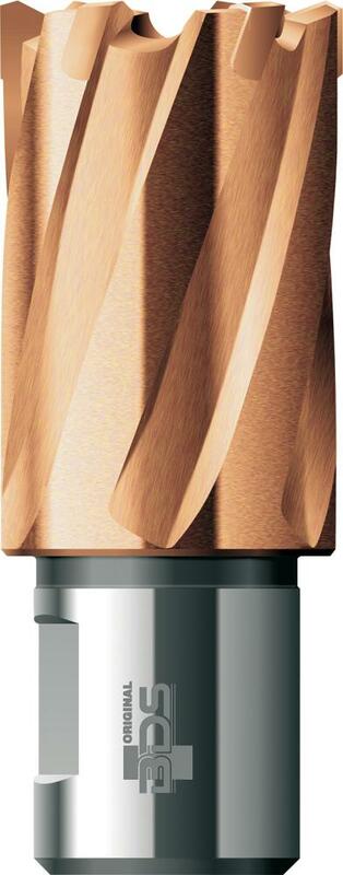 Jádrový vrták TK Provedení: Stopka Weldon s Ø 19 mm vnitřní otvor 6,35 mm. Použití: Na vrtačkách s magnetickým stojanem a stojanových vrtačkách s MK úchytem. Jádrový vrták obrábí pouze tenký kroužek materiálu. Odvrtané jádro se vyhazuje pružinovou silou pomocí vodicího a vyhazovacího kolíku. Třísky jsou odváděny nahoru, nebezpečí prasknutí se snižuje na minimum. Také vrtané otvory s velkým průměrem si vyžadují relativně málo energie. Jádrový vrták obrábí v porovnání se spirálovým vrtákem pouze malou část celkové plochy. Tímto se dosáhne velké úspory času a vynaložených sil.