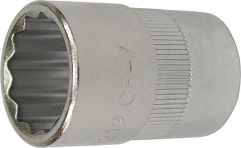 Adaptér-bit 1/2" , 12hran Provedení: DIN 3124 – ISO 2725-1, se záchytnou drážkou kuličky, drsně rýhovaná. Z chromvanadiové oceli, broušená a matově pochromovaná.