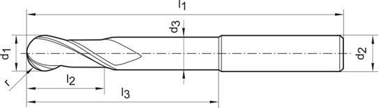 Rádiusová fréza z tvrdokovu Provedení: Zub do středu, vhodná k vrtání. Použití: Pro kopírovací frézování. Podbroušení krčku umožňuje optimální dosah nástroje, a fréza je proto vhodná pro použití v konstrukci forem. Životnost se prodlužuje při mazání minimálním množstvím maziva nebo při chlazení vzduchem. Nástroj lze podle volby použít buď s naklápěným nebo přímým vřetenem. Vhodná pro HSC obrábění do tvrdosti 62 HRC . Upozornění: Kopírovací frézování; optimálních hodnot řezu dosahuje při ap = 0,05 x d1 a ae = 0,1 x d1.