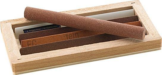 Sada brousků Provedení: Sada nejčastěji používaných brousků (10 x 100 mm) jak na hrubý, tak i na jemný brus. Dodáváme v dřevěném boxu. Obsah sady: 3 brousky, trojhran, ušlechtilý korund, hrubý, střední a jemný 1 brousek, kulatý, ušlechtilý korund, střední 1 brousek, trojhran, Arkansas, tvrdý