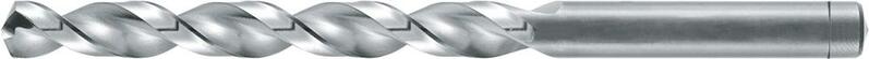 Spirálový vrták, válcová stopka Provedení: Obzvlášť stabilní model. Vybrušovaný profil, pravořezný, bez povlaku, od Ø 2,4 mm, nitridace zkosení, precizní křížový podbrus, jakož i široké drážky se zaoblená zadní hrana spirály na odvod třísek a vynikající odolností tvrdosti za tepla. Zahrocení dle DIN 1412, tvar A. Boční úhel čela je větší než běžný úhel, tloušťka jádra je silnější než běžná a žádné stoupání šroubovice. Použití: Díky nitridovaným fazetám a širokým drážkám na odvod třísek k vrtání do hloubky více než 3 x D. Zejména lze používat na legované a nelegované oceli, druhy litin s pevností nad 800 N/mm², oceli zpracovávané za tepla a za studena, typy oceli na valivá ložiska, vysoce legované oceli, zušlechťované oceli a cementační oceli.