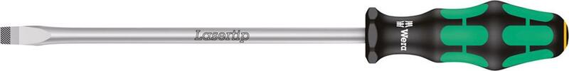 Plochý šroubovák s kulatou čepelí. Provedení: Z vysoce legované speciální oceli s kulatou elektrikářskou čepelí. Kromě toho mají šroubováky na hlavě vyražený symbol zakončení a velikost. Čepel s Lasertip a mikrodrsným povrchem. Redukuje přítlačnou sílu a zabraňuje vyklouznutí z hlavy šroubu. S ergonomickou 3složkovou rukojetí Kraftform-Plus, s integrovanými měkkými plochami pro lepší uchopení, ochranou proti odkutálení.