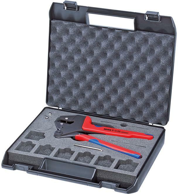 - V plastovém kufříku, pěnová vložka s prohlubněmi pro ukládání krimpovacích nástavců a polohovacích přípravků- s montážním nářadím (inbusový klíč), šrouby a matkami